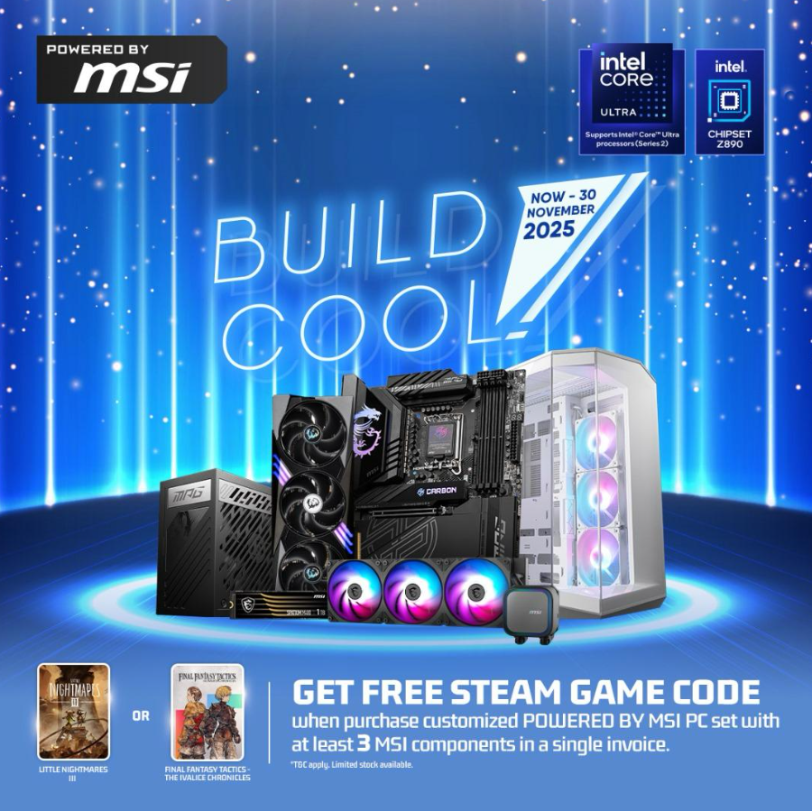 Get free STEAM game code when purchase customized POWERED BY MSI PC set with at least (1) MSI Motherboard + (1) MSI Graphics Card and another (1) MSI Components in a single invoice.