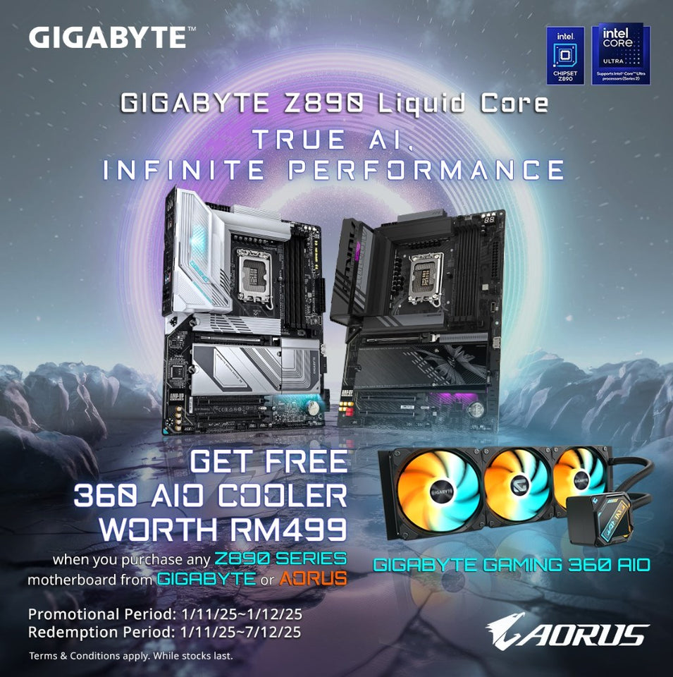 For a limited time only, GIGABYTE and AORUS are rewarding enthusiasts with a FREE GIGABYTE GAMING 360 AIO Cooler (worth RM499) when you purchase any Z890 Series motherboard.