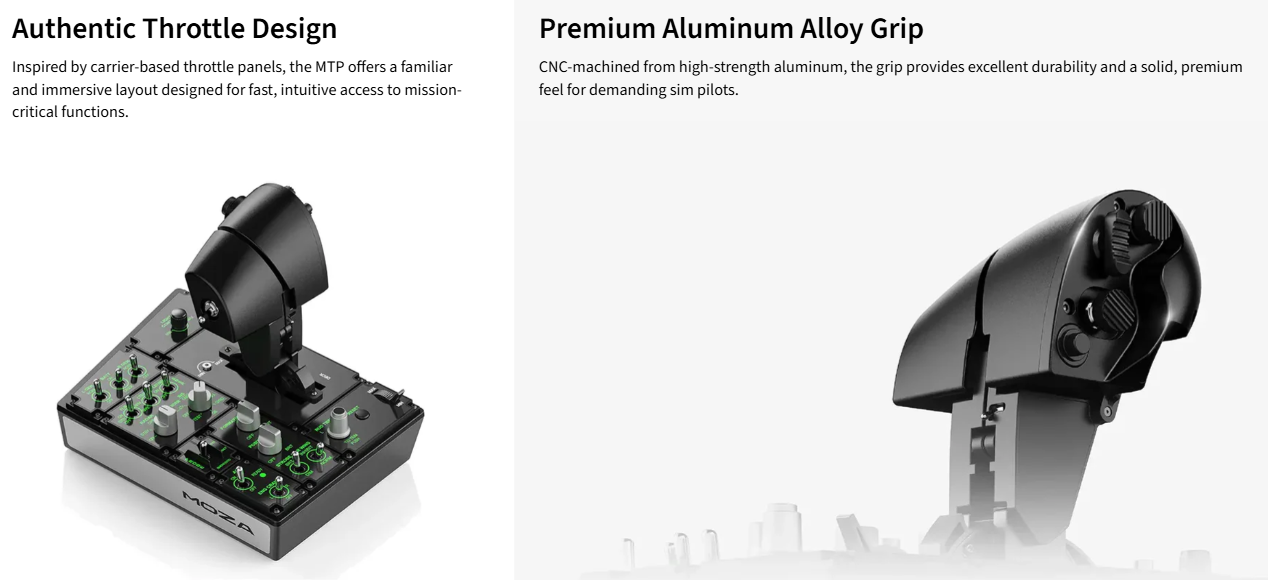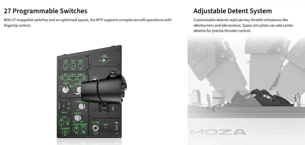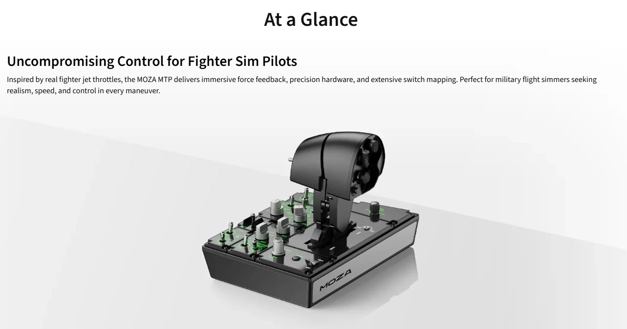 Designed for professional and enthusiast flight sim pilots, the MOZA MTP Throttle offers an authentic fighter jet-inspired experience. Its durable aluminum alloy grip, 27 programmable switches, and adjustable detent system provide precise control for critical flight maneuvers. Built-in vibration feedback enhances immersion by simulating real-world flight effects, while the 15-bit magnetic encoder and Hall-effect joystick ensure smooth, drift-free performance. Fully customizable via MOZA Cockpit software, the MTP Throttle seamlessly integrates with the MOZA MTLP panel for a complete flight deck setup. PC compatible, no additional plugins required.